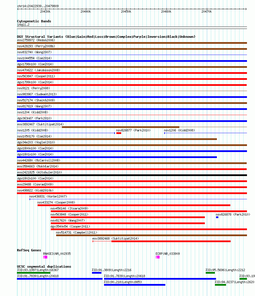 Variant DetailsVariant: nsv1052696 Internal ID | 18795227 | Landmark | | Location Information | | Cytoband | 14q11.2 | Allele length | Assembly | Allele length | hg38 | 56871 | hg19 | 56871 | hg18 | 56871 |