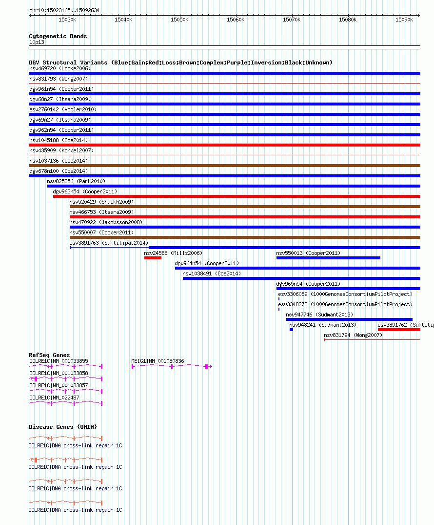Variant DetailsVariant: nsv1052809| Internal ID | 19142028 | | Landmark | | | Location Information | | | Cytoband | 10p13 | | Allele length | | Assembly | Allele length | | hg38 | 69470 | | hg19 | 69470 | | hg18 | 69470 |