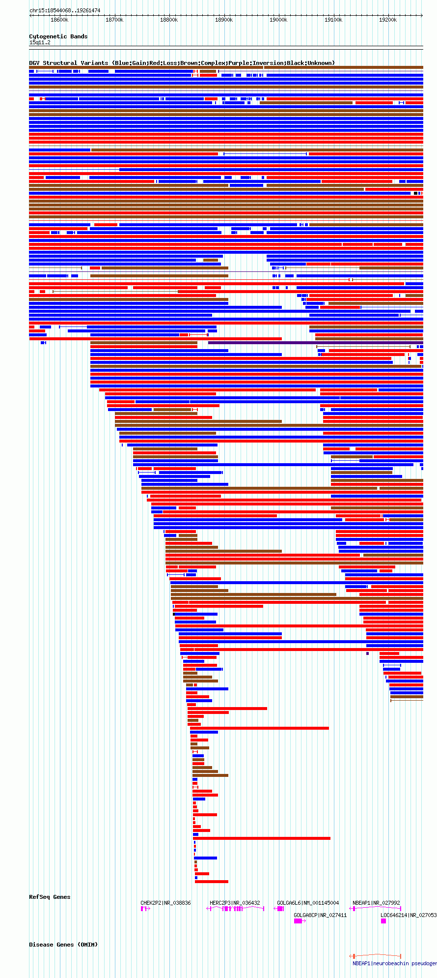 Variant DetailsVariant: nsv1052819| Internal ID | 19142038 | | Landmark | | | Location Information | | | Cytoband | 15q11.1 | | Allele length | | Assembly | Allele length | | hg38 | 717291 | | hg19 | 717367 | | hg18 | 717407 |