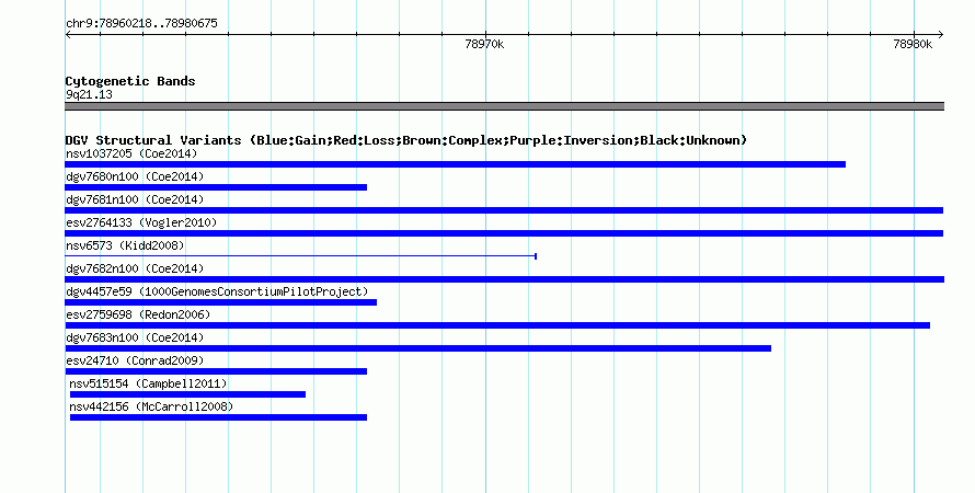 Variant DetailsVariant: nsv1053065Internal ID | 18795596 | Landmark | | Location Information | | Cytoband | 9q21.13 | Allele length | Assembly | Allele length | hg38 | 20458 | hg19 | 20458 | hg18 | 20458 |
