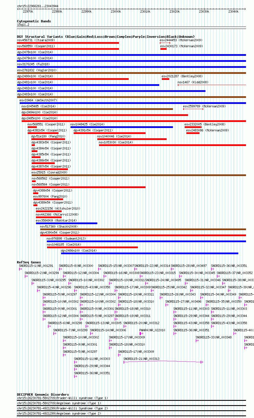 | | Variant Type | CNV gain+loss | | Copy Number | | | Allele State | | | Allele Origin | | | Probe Count | | | Validation Flag | | | Merged Status | M | | Merged Variants | dgv2483n100 | | Supporting Variants | nssv3545477, nssv3545478 | | Samples | | | Known Genes | PWAR4, SNORD115-1, SNORD115-10, SNORD115-11, SNORD115-12, SNORD115-13, SNORD115-14, SNORD115-15, SNORD115-16, SNORD115-17, SNORD115-18, SNORD115-19, SNORD115-2, SNORD115-20, SNORD115-21, SNORD115-22, SNORD115-23, SNORD115-24, SNORD115-25, SNORD115-26, SNORD115-27, SNORD115-28, SNORD115-29, SNORD115-3, SNORD115-30, SNORD115-31, SNORD115-32, SNORD115-33, SNORD115-34, SNORD115-35, SNORD115-36, SNORD115-37, SNORD115-38, SNORD115-39, SNORD115-4, SNORD115-40, SNORD115-41, SNORD115-42, SNORD115-43, SNORD115-5, SNORD115-6, SNORD115-7, SNORD115-8, SNORD115-9 | | Method | SNP array | | Analysis | Affymetrix SNP array copy number analysis | | Platform | Affymetrix SNP Array 6.0 | | Comments | | | Reference | Coe_et_al_2014 | | Pubmed ID | 25217958 | | Accession Number(s) | nsv1053067