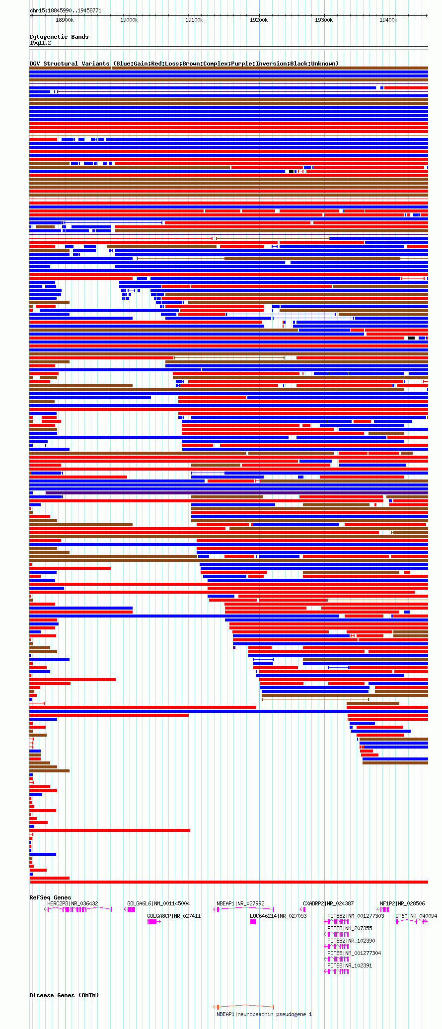 Variant DetailsVariant: nsv1053081| Internal ID | 19142300 | | Landmark | | | Location Information | | | Cytoband | 15q11.1 | | Allele length | | Assembly | Allele length | | hg38 | 608061 | | hg19 | 608137 | | hg18 | 612782 |