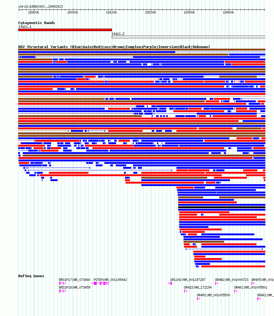 Variant DetailsVariant: nsv1053097| Internal ID | 19142316 | | Landmark | | | Location Information | | | Cytoband | 14q11.1 | | Allele length | | Assembly | Allele length | | hg38 | 723476 | | hg19 | 632241 | | hg18 | 632081 |