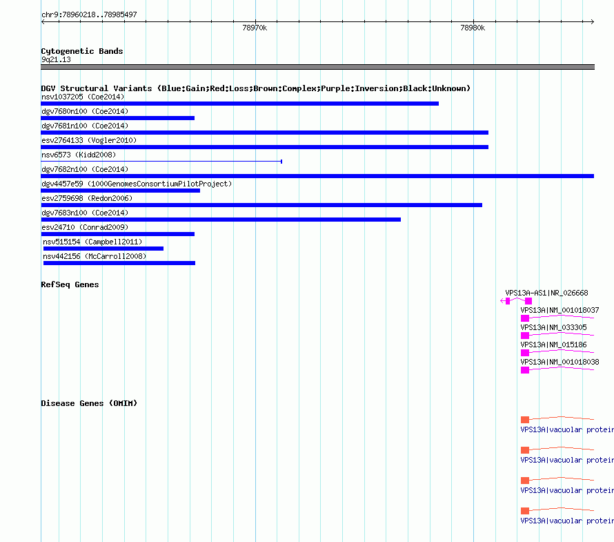| Variant Type | CNV gain | Copy Number | | Allele State | | Allele Origin | | Probe Count | | Validation Flag | | Merged Status | M | Merged Variants | dgv7682n100 | Supporting Variants | nssv3696396, nssv3696395 | Samples | | Known Genes | VPS13A, VPS13A-AS1 | Method | SNP array | Analysis | Affymetrix SNP array copy number analysis | Platform | Affymetrix SNP Array 6.0 | Comments | | Reference | Coe_et_al_2014 | Pubmed ID | 25217958 | Accession Number(s) | nsv1053136