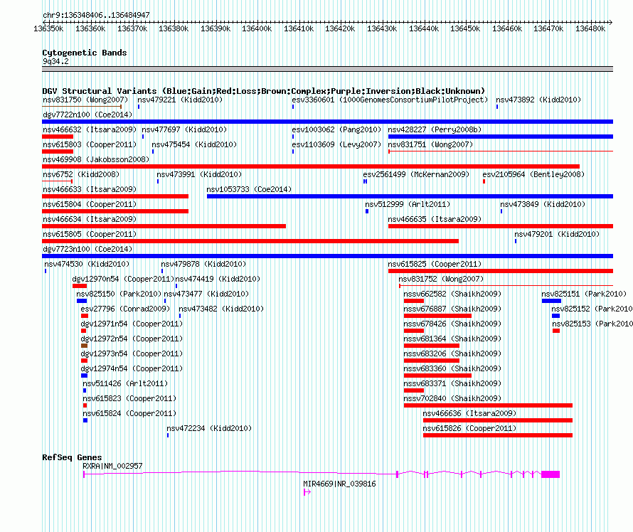 | | Variant Type | CNV gain | | Copy Number | | | Allele State | | | Allele Origin | | | Probe Count | | | Validation Flag | | | Merged Status | M | | Merged Variants | dgv7723n100 | | Supporting Variants | nssv3696428 | | Samples | | | Known Genes | MIR4669, RXRA | | Method | SNP array | | Analysis | Affymetrix SNP array copy number analysis | | Platform | Affymetrix SNP Array 6.0 | | Comments | | | Reference | Coe_et_al_2014 | | Pubmed ID | 25217958 | | Accession Number(s) | nsv1053174