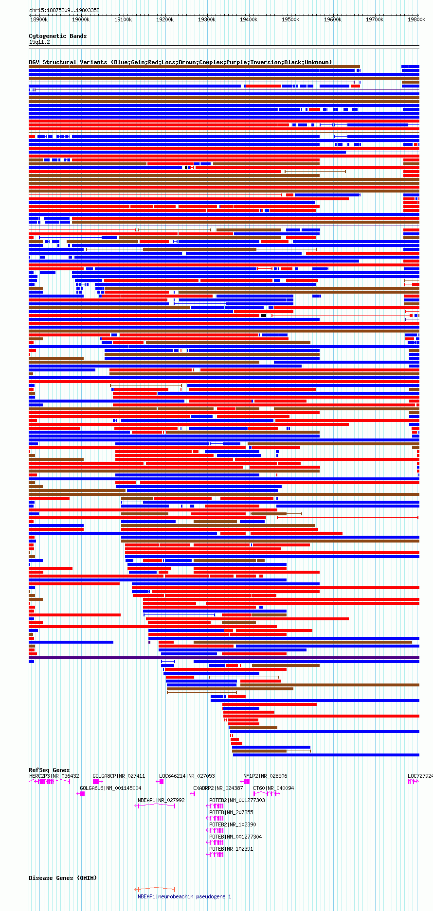 Variant DetailsVariant: nsv1053233| Internal ID | 19142452 | | Landmark | | | Location Information | | | Cytoband | 15q11.1 | | Allele length | | Assembly | Allele length | | hg38 | 1604002 | | hg19 | 1686700 | | hg18 | 928050 |