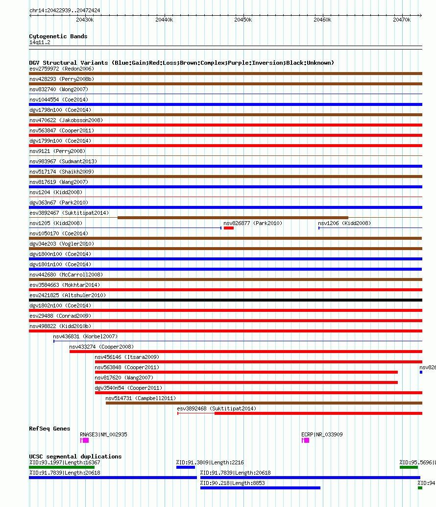 | Variant Type | CNV loss | Copy Number | | Allele State | | Allele Origin | | Probe Count | | Validation Flag | | Merged Status | M | Merged Variants | dgv1799n100 | Supporting Variants | nssv3530770, nssv3530769, nssv3530768 | Samples | | Known Genes | ECRP, RNASE3 | Method | SNP array | Analysis | Affymetrix SNP array copy number analysis | Platform | Affymetrix SNP Array 6.0 | Comments | | Reference | Coe_et_al_2014 | Pubmed ID | 25217958 | Accession Number(s) | nsv1053464