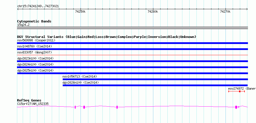 Variant DetailsVariant: nsv1053572| Internal ID | 19142791 | | Landmark | | | Location Information | | | Cytoband | 15q24.2 | | Allele length | | Assembly | Allele length | | hg38 | 31773 | | hg19 | 31773 | | hg18 | 31773 |