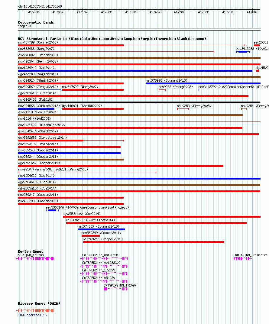 | | Variant Type | CNV loss | | Copy Number | | | Allele State | | | Allele Origin | | | Probe Count | | | Validation Flag | | | Merged Status | M | | Merged Variants | dgv2585n100 | | Supporting Variants | nssv3552324, nssv3716717 | | Samples | | | Known Genes | CATSPER2, CKMT1A, STRC | | Method | SNP array | | Analysis | Affymetrix SNP array copy number analysis | | Platform | Affymetrix SNP Array 6.0 | | Comments | | | Reference | Coe_et_al_2014 | | Pubmed ID | 25217958 | | Accession Number(s) | nsv1053621