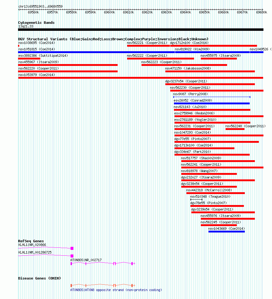 | | Variant Type | CNV loss | | Copy Number | | | Allele State | | | Allele Origin | | | Probe Count | | | Validation Flag | | | Merged Status | M | | Merged Variants | | | Supporting Variants | nssv3529288 | | Samples | | | Known Genes | ATXN8OS, KLHL1 | | Method | SNP array | | Analysis | Affymetrix SNP array copy number analysis | | Platform | Affymetrix SNP Array 6.0 | | Comments | | | Reference | Coe_et_al_2014 | | Pubmed ID | 25217958 | | Accession Number(s) | nsv1053979