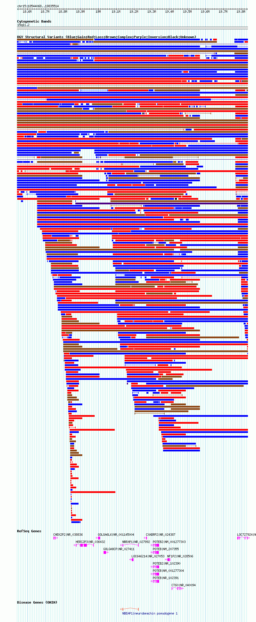 Variant DetailsVariant: nsv1054245| Internal ID | 19143464 | | Landmark | | | Location Information | | | Cytoband | 15q11.1 | | Allele length | | Assembly | Allele length | | hg38 | 1967399 | | hg19 | 2050097 | | hg18 | 1291447 |