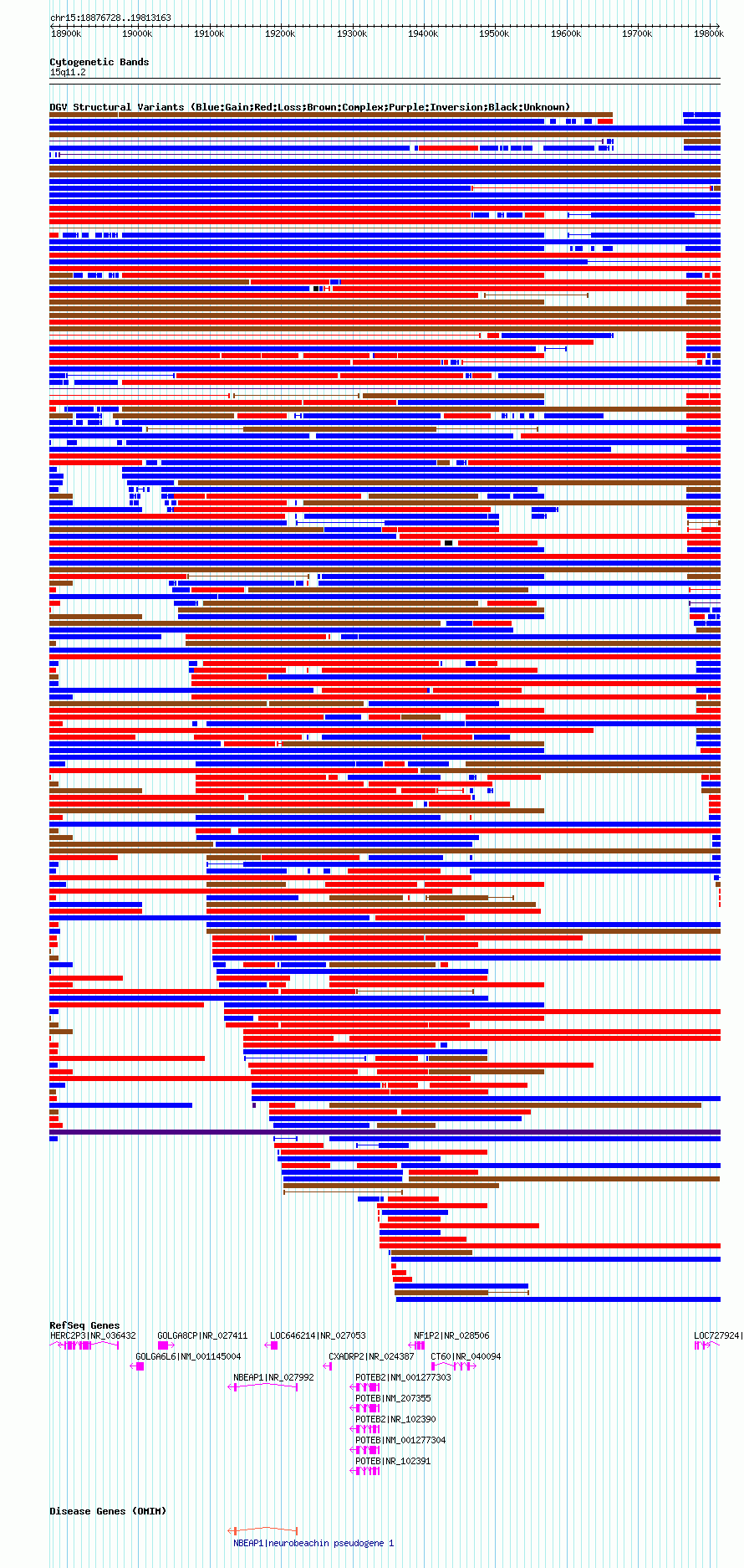 Variant DetailsVariant: nsv1054315| Internal ID | 19143534 | | Landmark | | | Location Information | | | Cytoband | 15q11.1 | | Allele length | | Assembly | Allele length | | hg38 | 1612388 | | hg19 | 1695086 | | hg18 | 936436 |