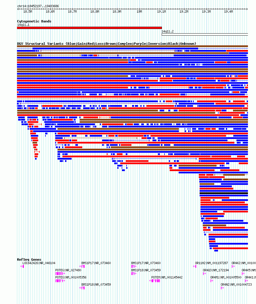 Variant DetailsVariant: nsv1054599| Internal ID | 19143818 | | Landmark | | | Location Information | | | Cytoband | 14q11.1 | | Allele length | | Assembly | Allele length | | hg38 | 1339968 | | hg19 | 1031650 | | hg18 | 1031490 |