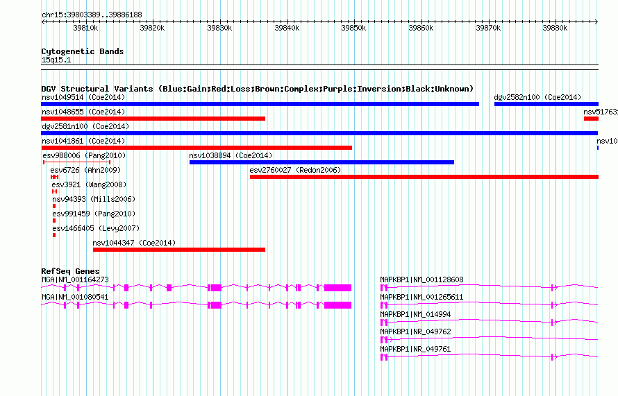 | | Variant Type | CNV gain | | Copy Number | | | Allele State | | | Allele Origin | | | Probe Count | | | Validation Flag | | | Merged Status | M | | Merged Variants | dgv2581n100 | | Supporting Variants | nssv3552263 | | Samples | | | Known Genes | MAPKBP1, MGA | | Method | SNP array | | Analysis | Affymetrix SNP array copy number analysis | | Platform | Affymetrix SNP Array 6.0 | | Comments | | | Reference | Coe_et_al_2014 | | Pubmed ID | 25217958 | | Accession Number(s) | nsv1054671