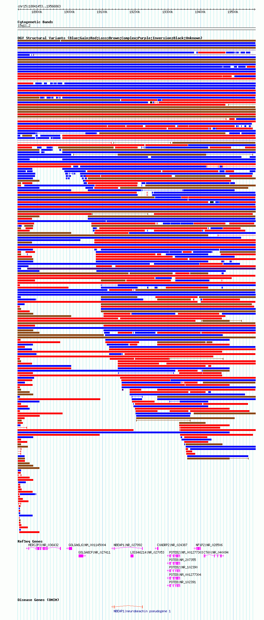 Variant DetailsVariant: nsv1054706| Internal ID | 19143925 | | Landmark | | | Location Information | | | Cytoband | 15q11.1 | | Allele length | | Assembly | Allele length | | hg38 | 720690 | | hg19 | 720766 | | hg18 | 725411 |