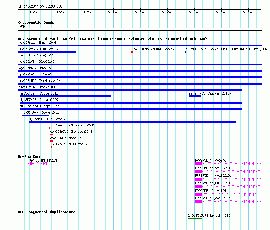 Variant DetailsVariant: nsv1054848| Internal ID | 18797379 | | Landmark | | | Location Information | | | Cytoband | 14q23.2 | | Allele length | | Assembly | Allele length | | hg38 | 89849 | | hg19 | 89849 | | hg18 | 89849 |