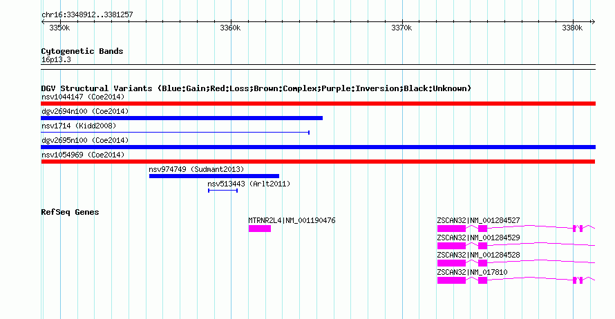 Variant DetailsVariant: nsv1054969| Internal ID | 19144188 | | Landmark | | | Location Information | | | Cytoband | 16p13.3 | | Allele length | | Assembly | Allele length | | hg38 | 32346 | | hg19 | 32346 | | hg18 | 32346 |