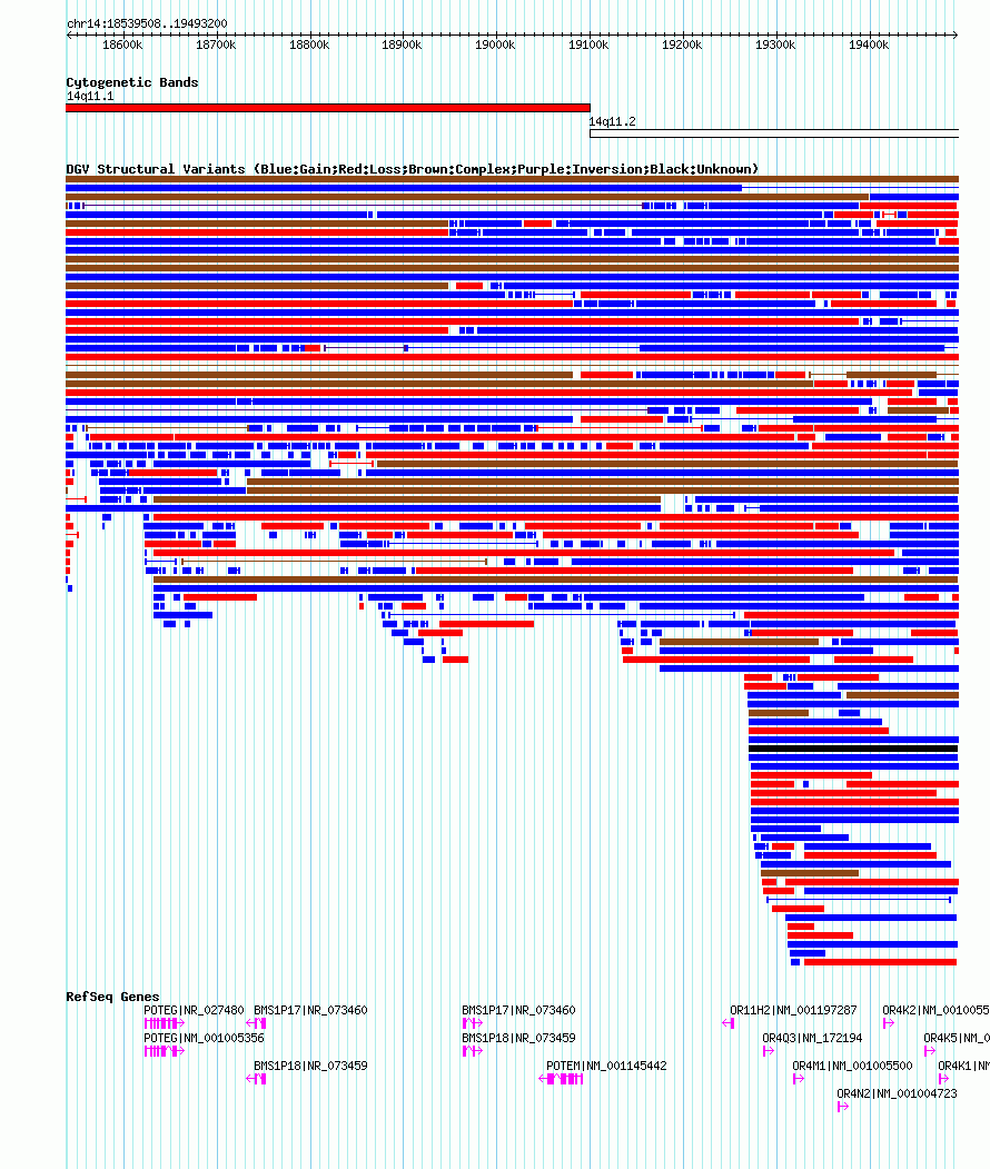 Variant DetailsVariant: nsv1055010| Internal ID | 19144229 | | Landmark | | | Location Information | | | Cytoband | 14q11.1 | | Allele length | | Assembly | Allele length | | hg38 | 1262171 | | hg19 | 953853 | | hg18 | 953693 |