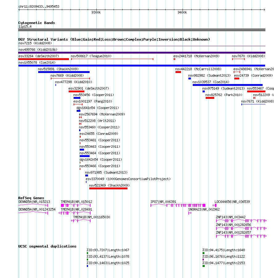 | Variant Type | CNV gain | Copy Number | | Allele State | | Allele Origin | | Probe Count | | Validation Flag | | Merged Status | M | Merged Variants | | Supporting Variants | nssv3518089 | Samples | | Known Genes | DENND5A, IPO7, LOC644656, SNORA23, TMEM41B, ZNF143 | Method | SNP array | Analysis | Affymetrix SNP array copy number analysis | Platform | Affymetrix SNP Array 6.0 | Comments | | Reference | Coe_et_al_2014 | Pubmed ID | 25217958 | Accession Number(s) | nsv1055078