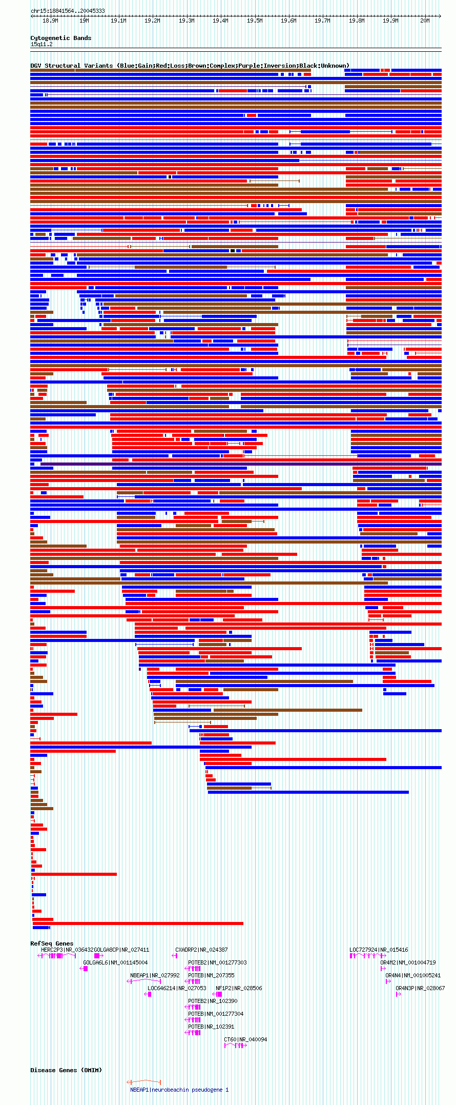 Variant DetailsVariant: nsv1055079| Internal ID | 19144298 | | Landmark | | | Location Information | | | Cytoband | 15q11.1 | | Allele length | | Assembly | Allele length | | hg38 | 1879722 | | hg19 | 1962420 | | hg18 | 1203770 |