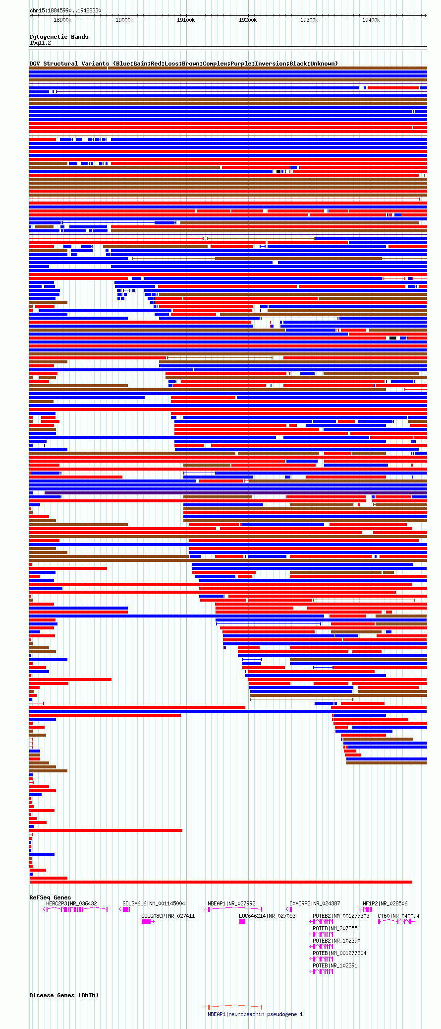 Variant DetailsVariant: nsv1055092| Internal ID | 19144311 | | Landmark | | | Location Information | | | Cytoband | 15q11.1 | | Allele length | | Assembly | Allele length | | hg38 | 637620 | | hg19 | 637696 | | hg18 | 642341 |
