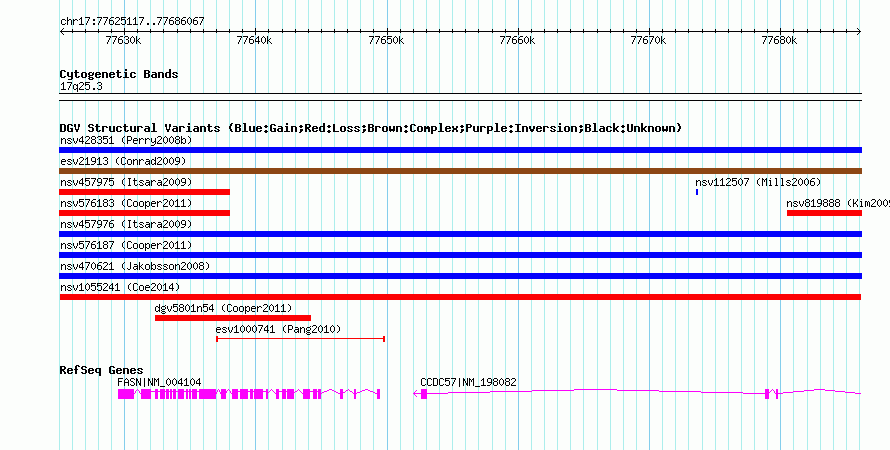 Variant DetailsVariant: nsv1055241| Internal ID | 19144460 | | Landmark | | | Location Information | | | Cytoband | 17q25.3 | | Allele length | | Assembly | Allele length | | hg38 | 60951 | | hg19 | 60951 | | hg18 | 60951 |