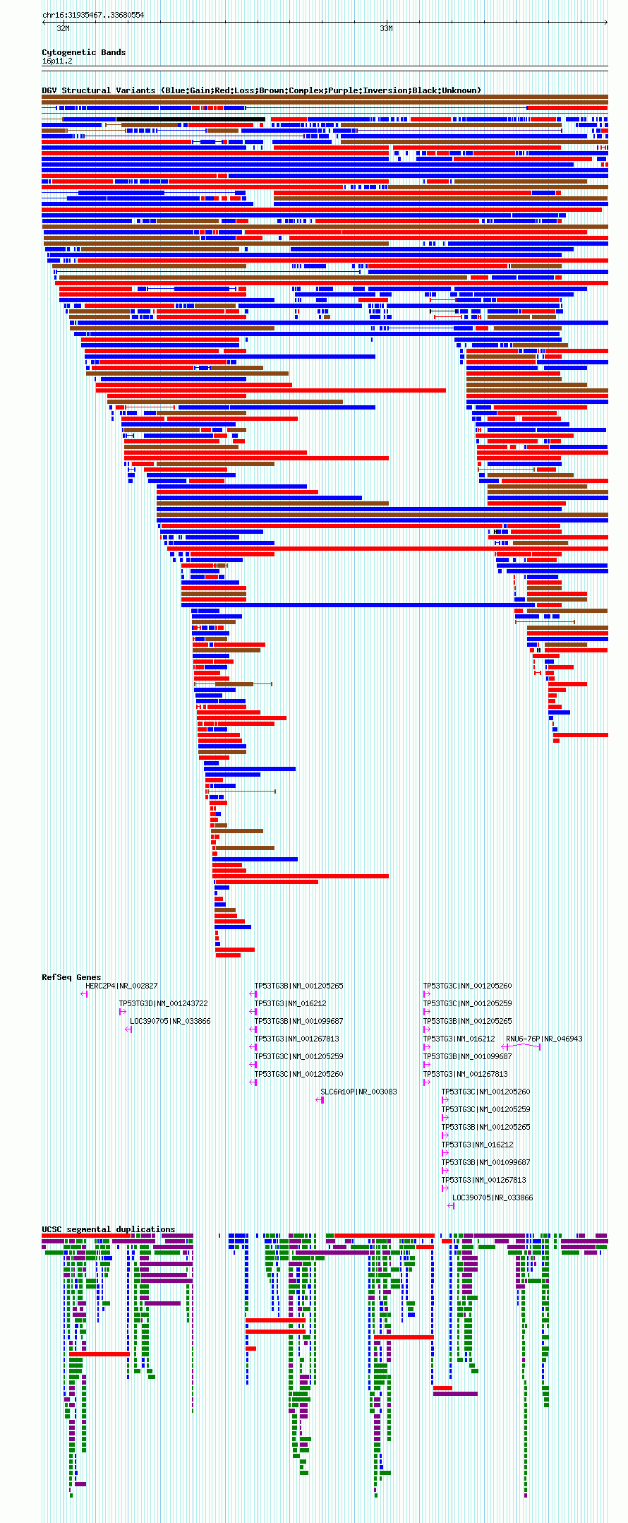 | | Variant Type | CNV gain | | Copy Number | | | Allele State | | | Allele Origin | | | Probe Count | | | Validation Flag | | | Merged Status | M | | Merged Variants | dgv2840n100 | | Supporting Variants | nssv3549198, nssv3716200, nssv3549202, nssv3549199, nssv3549200, nssv3549201, nssv3716199, nssv3716197, nssv3549203, nssv3716198 | | Samples | | | Known Genes | HERC2P4, LOC390705, RNU6-76P, SLC6A10P, TP53TG3, TP53TG3B, TP53TG3C, TP53TG3D | | Method | SNP array | | Analysis | Affymetrix SNP array copy number analysis | | Platform | Affymetrix SNP Array 6.0 | | Comments | | | Reference | Coe_et_al_2014 | | Pubmed ID | 25217958 | | Accession Number(s) | nsv1055261