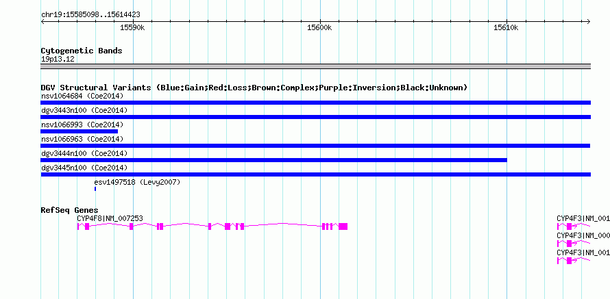 | | Variant Type | CNV gain | | Copy Number | | | Allele State | | | Allele Origin | | | Probe Count | | | Validation Flag | | | Merged Status | M | | Merged Variants | dgv3445n100 | | Supporting Variants | nssv3564802, nssv3564801 | | Samples | | | Known Genes | CYP4F3, CYP4F8 | | Method | SNP array | | Analysis | Affymetrix SNP array copy number analysis | | Platform | Affymetrix SNP Array 6.0 | | Comments | | | Reference | Coe_et_al_2014 | | Pubmed ID | 25217958 | | Accession Number(s) | nsv1055298