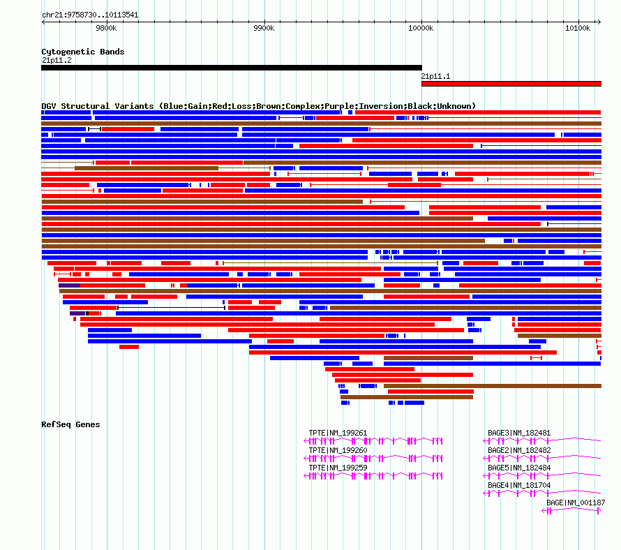 Variant DetailsVariant: nsv1055300| Internal ID | 19144519 | | Landmark | | | Location Information | | | Cytoband | 21p11.1 | | Allele length | | Assembly | Allele length | | hg38 | 354812 | | hg19 | 354812 | | hg18 | 354812 |