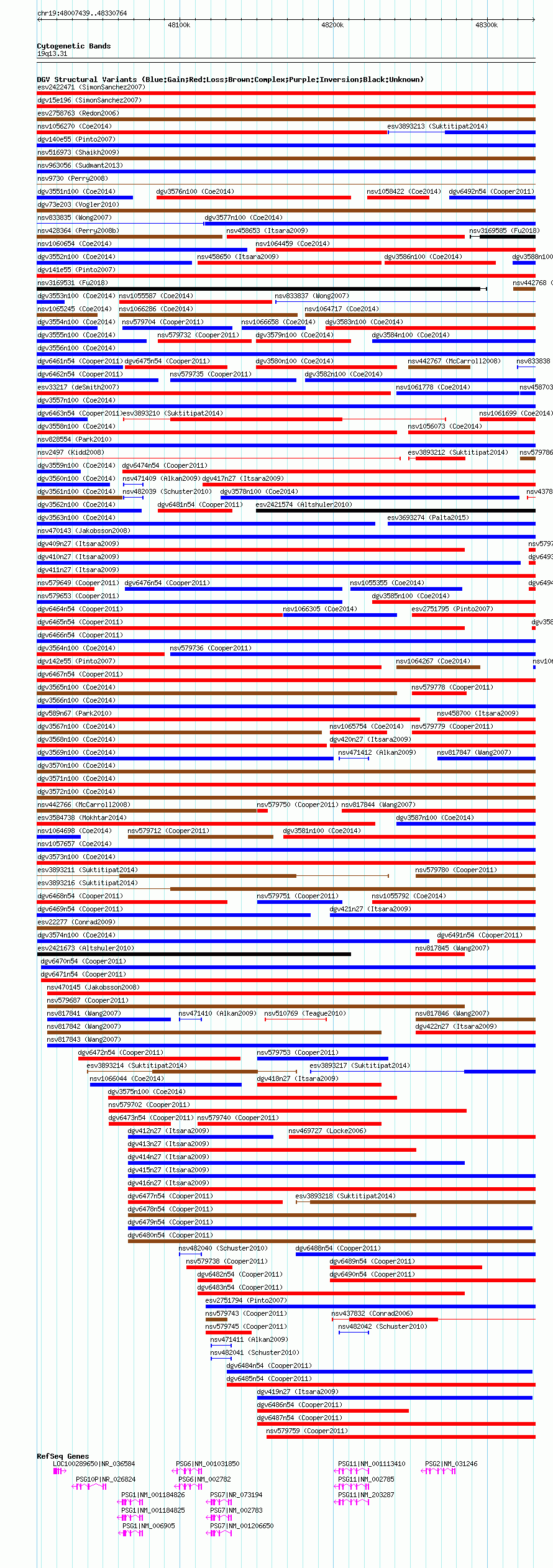 Variant DetailsVariant: nsv1055494| Internal ID | 19144713 | | Landmark | | | Location Information | | | Cytoband | 19q13.2 | | Allele length | | Assembly | Allele length | | hg38 | 323326 | | hg19 | 323326 | | hg18 | 323326 |