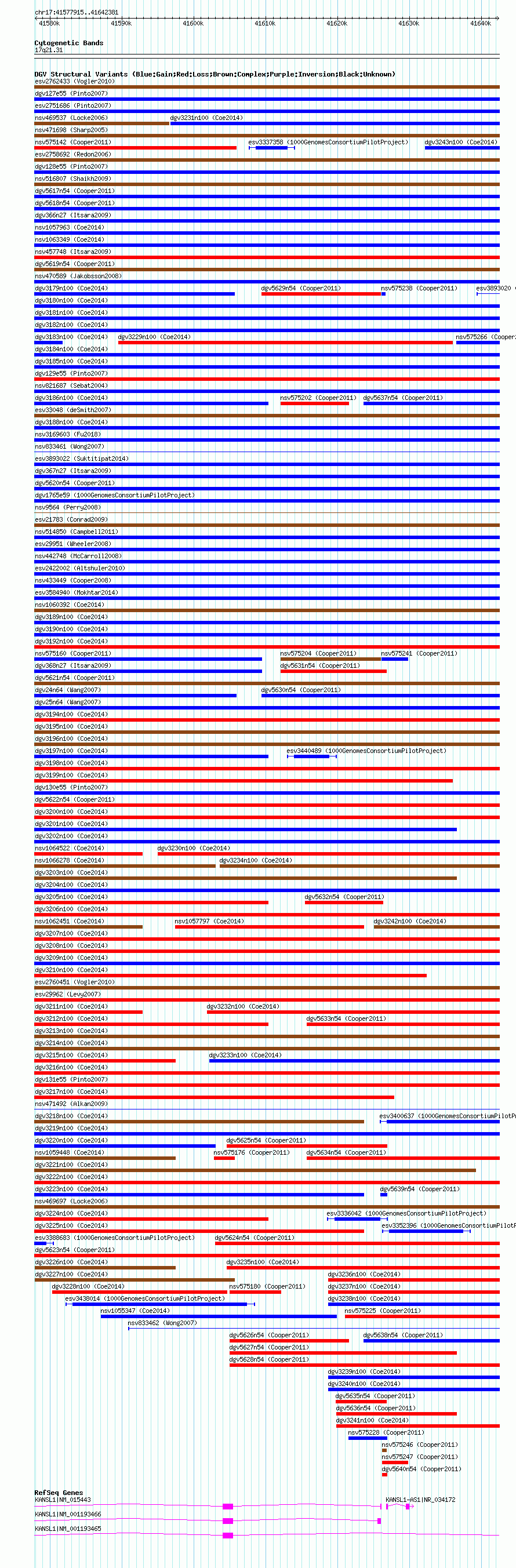 Variant DetailsVariant: nsv1055651| Internal ID | 19144870 | | Landmark | | | Location Information | | | Cytoband | 17q21.31 | | Allele length | | Assembly | Allele length | | hg38 | 64467 | | hg19 | 64467 | | hg18 | 64467 |