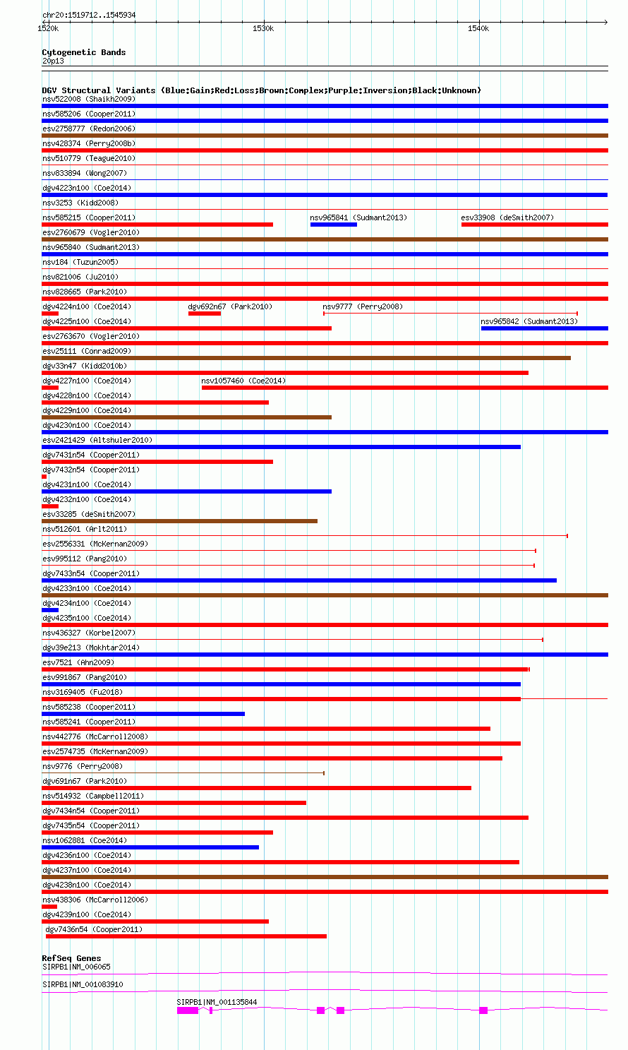 | | Variant Type | CNV loss | | Copy Number | | | Allele State | | | Allele Origin | | | Probe Count | | | Validation Flag | | | Merged Status | M | | Merged Variants | dgv4238n100 | | Supporting Variants | nssv3599327, nssv3599328 | | Samples | | | Known Genes | SIRPB1 | | Method | SNP array | | Analysis | Affymetrix SNP array copy number analysis | | Platform | Affymetrix SNP Array 6.0 | | Comments | | | Reference | Coe_et_al_2014 | | Pubmed ID | 25217958 | | Accession Number(s) | nsv1055704