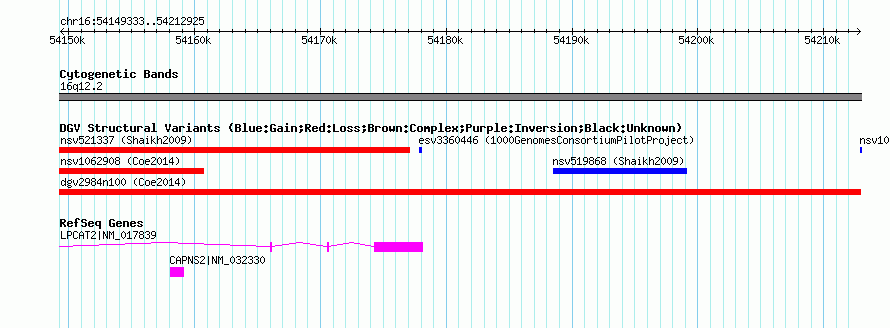 | | Variant Type | CNV loss | | Copy Number | | | Allele State | | | Allele Origin | | | Probe Count | | | Validation Flag | | | Merged Status | M | | Merged Variants | dgv2984n100 | | Supporting Variants | nssv3559288 | | Samples | | | Known Genes | CAPNS2, LPCAT2 | | Method | SNP array | | Analysis | Affymetrix SNP array copy number analysis | | Platform | Affymetrix SNP Array 6.0 | | Comments | | | Reference | Coe_et_al_2014 | | Pubmed ID | 25217958 | | Accession Number(s) | nsv1055829