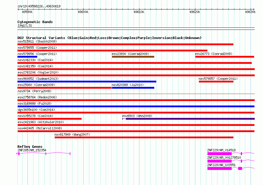 Variant DetailsVariant: nsv1055870| Internal ID | 19145089 | | Landmark | | | Location Information | | | Cytoband | 19q13.31 | | Allele length | | Assembly | Allele length | | hg38 | 42383 | | hg19 | 42394 | | hg18 | 42394 |