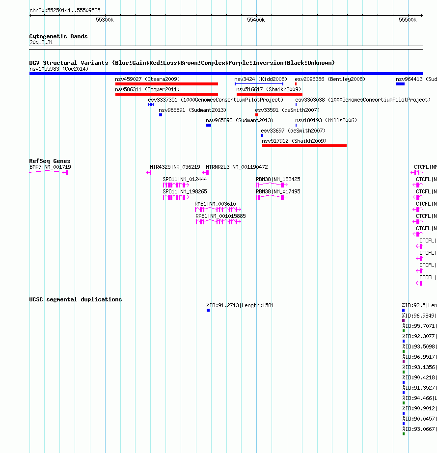 Variant DetailsVariant: nsv1055983| Internal ID | 18798514 | | Landmark | | | Location Information | | | Cytoband | 20q13.31 | | Allele length | | Assembly | Allele length | | hg38 | 259386 | | hg19 | 259386 | | hg18 | 259385 |