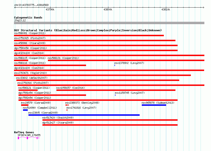 | Variant Type | CNV loss | Copy Number | | Allele State | | Allele Origin | | Probe Count | | Validation Flag | | Merged Status | M | Merged Variants | dgv4321n100 | Supporting Variants | nssv3731359, nssv3584930 | Samples | | Known Genes | SPINT4 | Method | SNP array | Analysis | Affymetrix SNP array copy number analysis | Platform | Affymetrix SNP Array 6.0 | Comments | | Reference | Coe_et_al_2014 | Pubmed ID | 25217958 | Accession Number(s) | nsv1056042