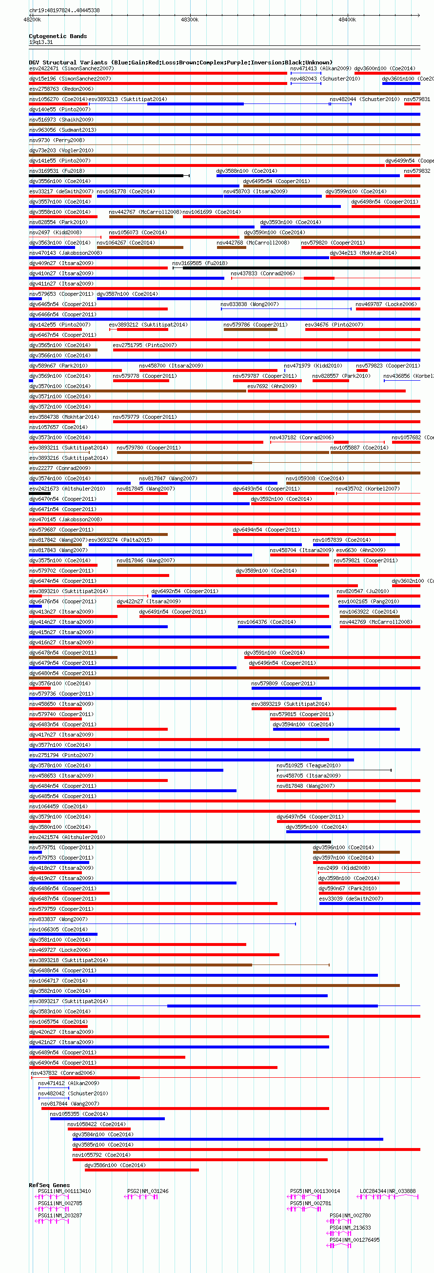 Variant DetailsVariant: nsv1056128| Internal ID | 19145347 | | Landmark | | | Location Information | | | Cytoband | 19q13.31 | | Allele length | | Assembly | Allele length | | hg38 | 247515 | | hg19 | 247515 | | hg18 | 247515 |
