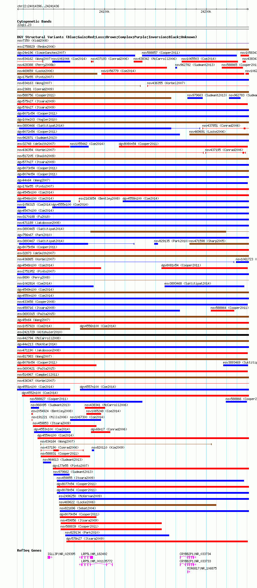 Variant DetailsVariant: nsv1056415| Internal ID | 19145634 | | Landmark | | | Location Information | | | Cytoband | 22q11.23 | | Allele length | | Assembly | Allele length | | hg38 | 227041 | | hg19 | 227041 | | hg18 | 227041 |