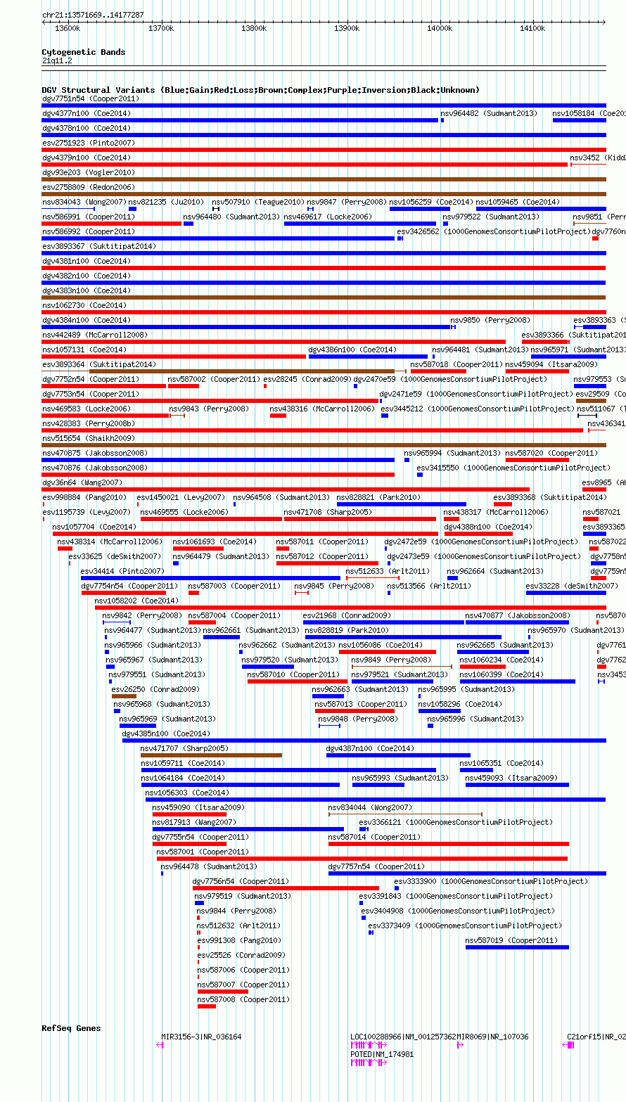 | | Variant Type | CNV gain | | Copy Number | | | Allele State | | | Allele Origin | | | Probe Count | | | Validation Flag | | | Merged Status | M | | Merged Variants | dgv4382n100 | | Supporting Variants | nssv3585323 | | Samples | | | Known Genes | C21orf15, LOC100288966, MIR3156-3, MIR8069, POTED | | Method | SNP array | | Analysis | Affymetrix SNP array copy number analysis | | Platform | Affymetrix SNP Array 6.0 | | Comments | | | Reference | Coe_et_al_2014 | | Pubmed ID | 25217958 | | Accession Number(s) | nsv1056514