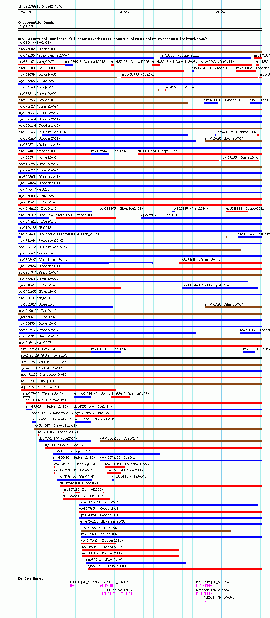 Variant DetailsVariant: nsv1056560| Internal ID | 19145779 | | Landmark | | | Location Information | | | Cytoband | 22q11.23 | | Allele length | | Assembly | Allele length | | hg38 | 249131 | | hg19 | 249131 | | hg18 | 249131 |