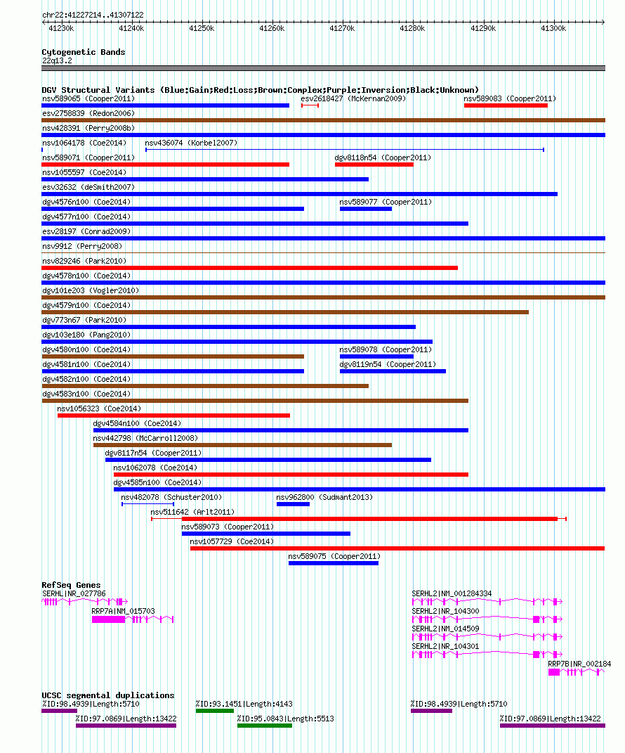 | Variant Type | CNV gain | Copy Number | | Allele State | | Allele Origin | | Probe Count | | Validation Flag | | Merged Status | M | Merged Variants | dgv4578n100 | Supporting Variants | nssv3737420, nssv3737419 | Samples | | Known Genes | RRP7A, RRP7B, SERHL, SERHL2 | Method | SNP array | Analysis | Affymetrix SNP array copy number analysis | Platform | Affymetrix SNP Array 6.0 | Comments | | Reference | Coe_et_al_2014 | Pubmed ID | 25217958 | Accession Number(s) | nsv1056630
