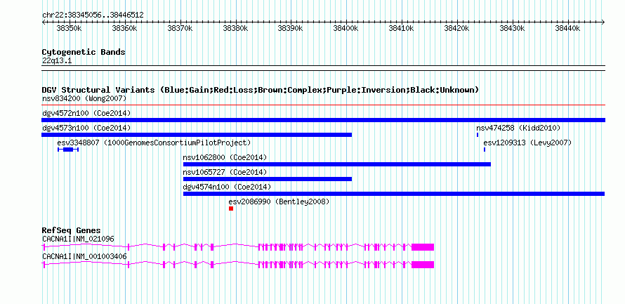 | | Variant Type | CNV gain | | Copy Number | | | Allele State | | | Allele Origin | | | Probe Count | | | Validation Flag | | | Merged Status | M | | Merged Variants | dgv4572n100 | | Supporting Variants | nssv3590793, nssv3590792 | | Samples | | | Known Genes | CACNA1I | | Method | SNP array | | Analysis | Affymetrix SNP array copy number analysis | | Platform | Affymetrix SNP Array 6.0 | | Comments | | | Reference | Coe_et_al_2014 | | Pubmed ID | 25217958 | | Accession Number(s) | nsv1056681