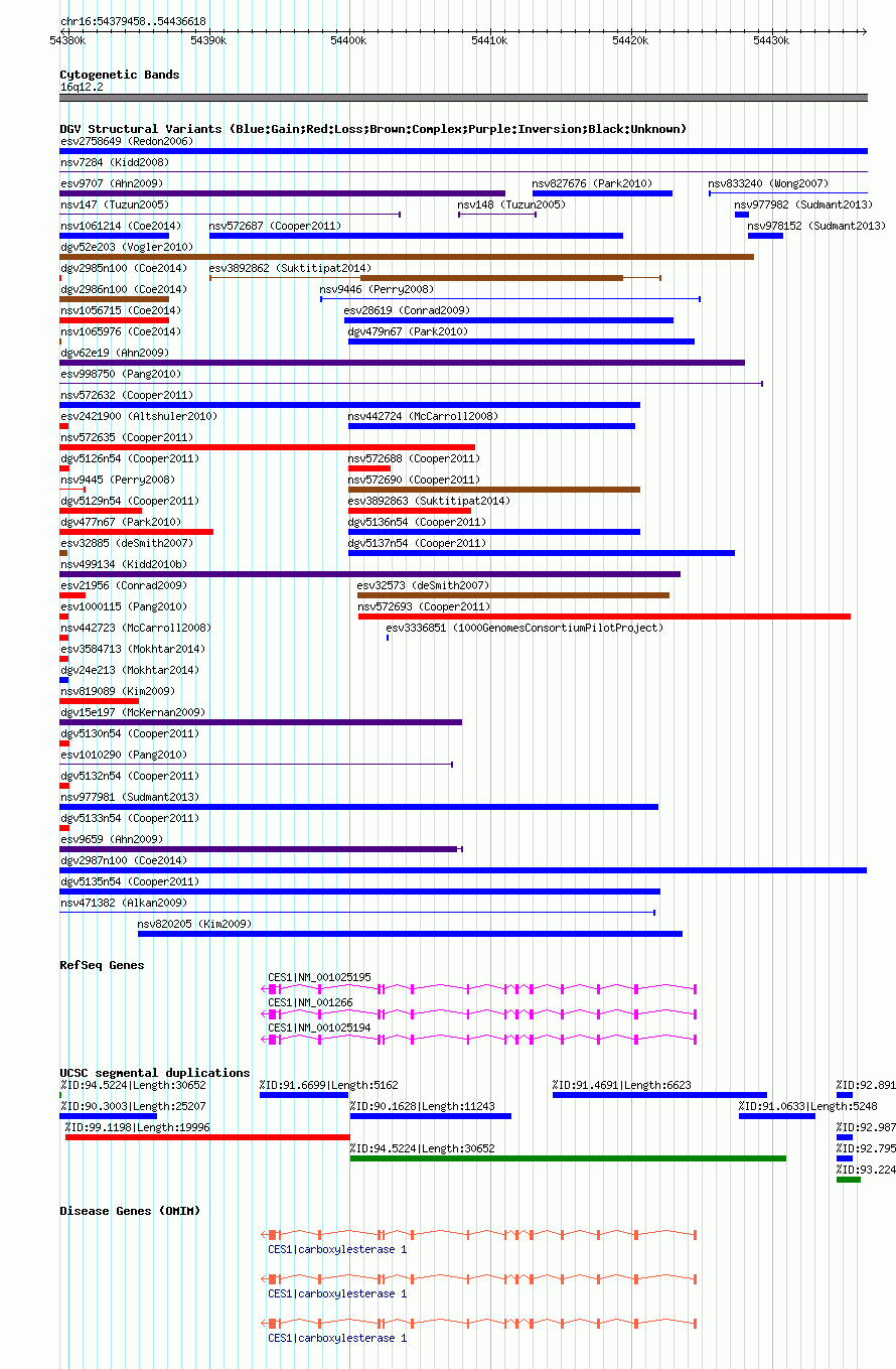 Variant DetailsVariant: nsv1056719| Internal ID | 18799250 | | Landmark | | | Location Information | | | Cytoband | 16q12.2 | | Allele length | | Assembly | Allele length | | hg38 | 57161 | | hg19 | 57161 | | hg18 | 57161 |