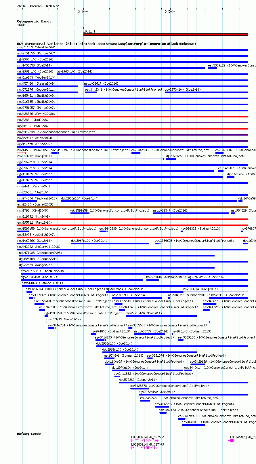 Variant DetailsVariant: nsv1056720| Internal ID | 19145939 | | Landmark | | | Location Information | | | Cytoband | 16p11.1 | | Allele length | | Assembly | Allele length | | hg38 | 264713 | | hg19 | 264713 | | hg18 | 264713 |