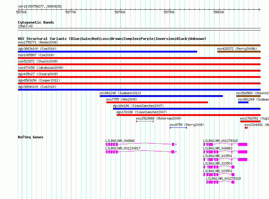 Variant DetailsVariant: nsv1056888| Internal ID | 19146107 | | Landmark | | | Location Information | | | Cytoband | 19q13.42 | | Allele length | | Assembly | Allele length | | hg38 | 49008 | | hg19 | 49015 | | hg18 | 49015 |