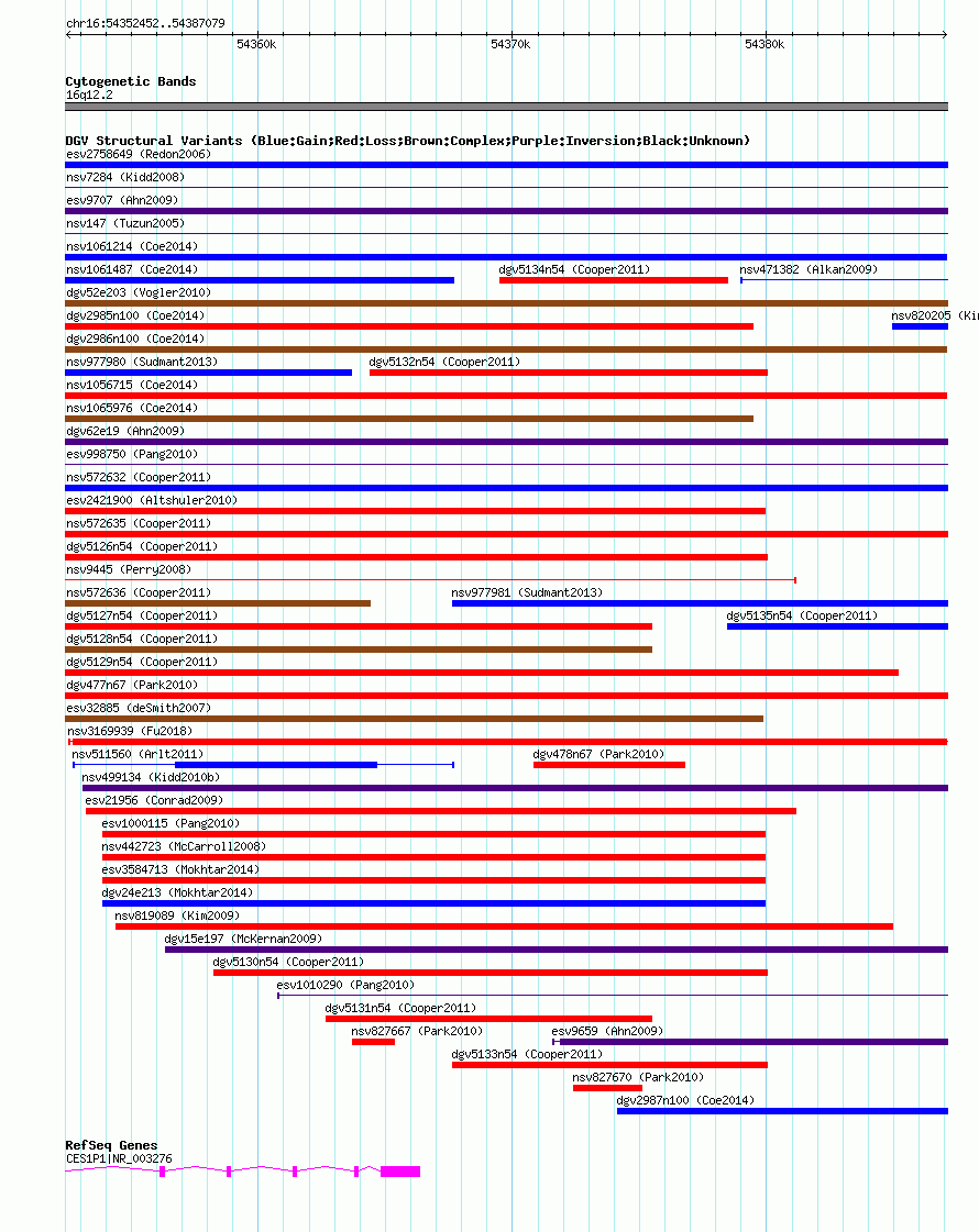 Variant DetailsVariant: nsv1056957| Internal ID | 19146176 | | Landmark | | | Location Information | | | Cytoband | 16q12.2 | | Allele length | | Assembly | Allele length | | hg38 | 34628 | | hg19 | 34628 | | hg18 | 34628 |