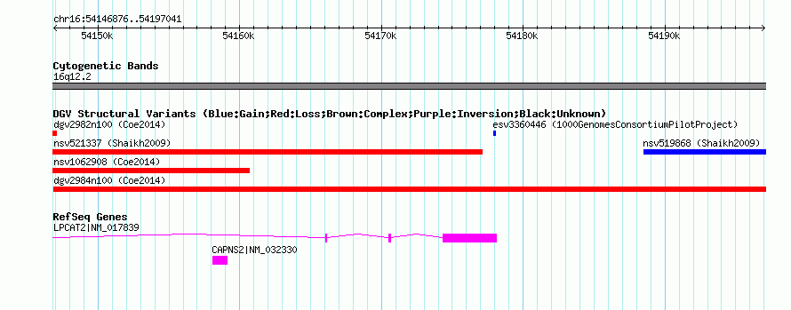 | | Variant Type | CNV loss | | Copy Number | | | Allele State | | | Allele Origin | | | Probe Count | | | Validation Flag | | | Merged Status | M | | Merged Variants | dgv2984n100 | | Supporting Variants | nssv3559287 | | Samples | | | Known Genes | CAPNS2, LPCAT2 | | Method | SNP array | | Analysis | Affymetrix SNP array copy number analysis | | Platform | Affymetrix SNP Array 6.0 | | Comments | | | Reference | Coe_et_al_2014 | | Pubmed ID | 25217958 | | Accession Number(s) | nsv1057132