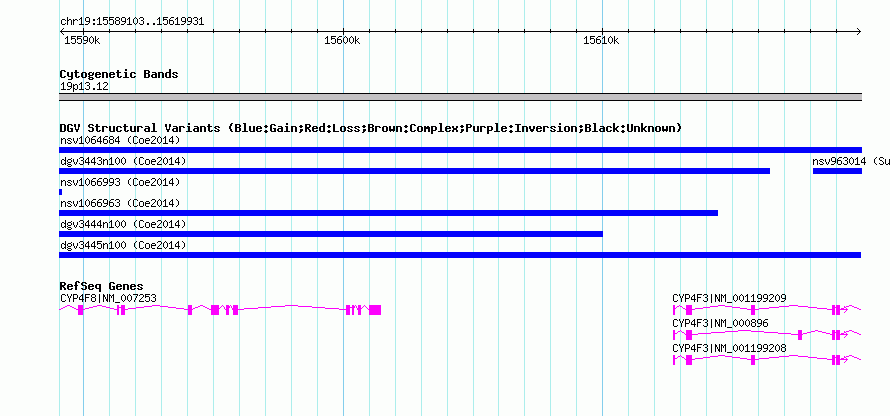 | | Variant Type | CNV gain | | Copy Number | | | Allele State | | | Allele Origin | | | Probe Count | | | Validation Flag | | | Merged Status | M | | Merged Variants | dgv3445n100 | | Supporting Variants | nssv3564804 | | Samples | | | Known Genes | CYP4F3, CYP4F8 | | Method | SNP array | | Analysis | Affymetrix SNP array copy number analysis | | Platform | Affymetrix SNP Array 6.0 | | Comments | | | Reference | Coe_et_al_2014 | | Pubmed ID | 25217958 | | Accession Number(s) | nsv1057215