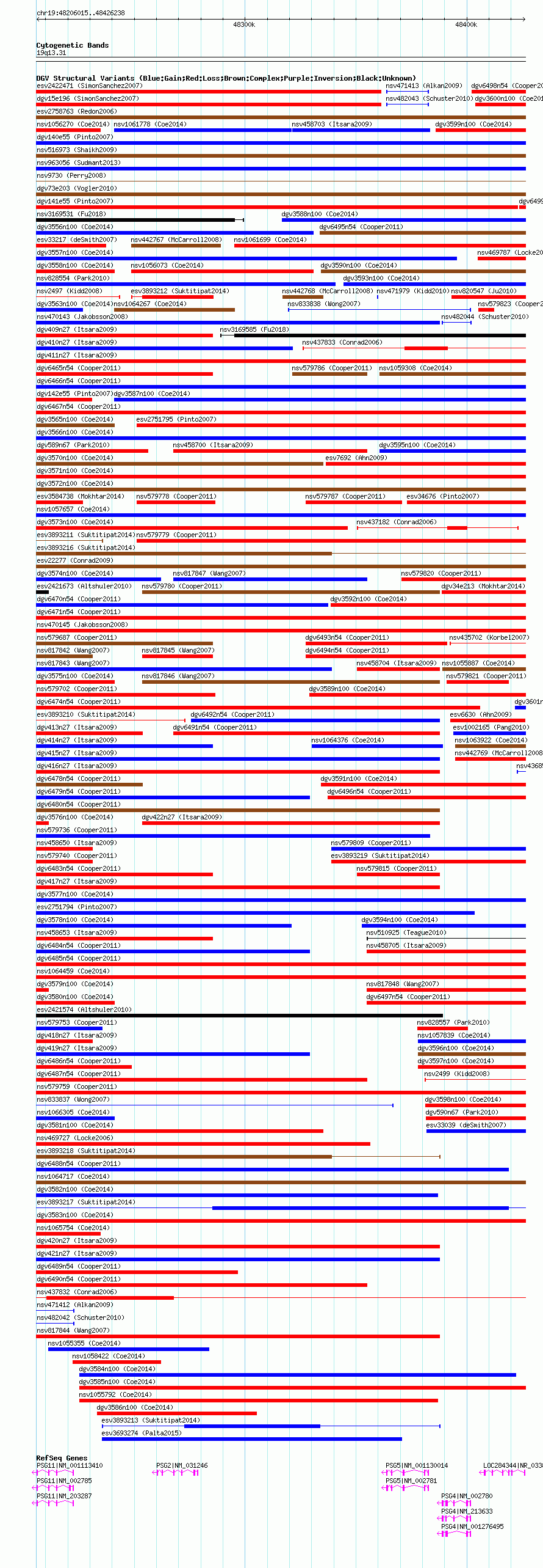 Variant DetailsVariant: nsv1057345| Internal ID | 19146564 | | Landmark | | | Location Information | | | Cytoband | 19q13.31 | | Allele length | | Assembly | Allele length | | hg38 | 220224 | | hg19 | 220224 | | hg18 | 220224 |