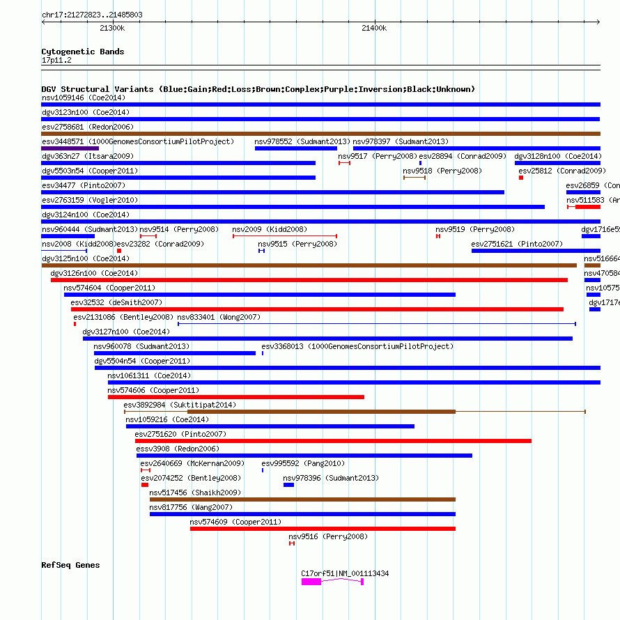 Variant DetailsVariant: nsv1057365| Internal ID | 19146584 | | Landmark | | | Location Information | | | Cytoband | 17p11.2 | | Allele length | | Assembly | Allele length | | hg38 | 213048 | | hg19 | 212981 | | hg18 | 212981 |